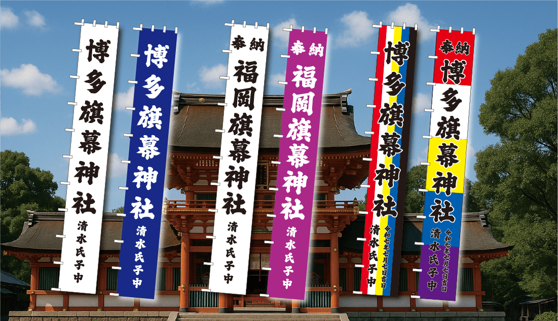 博多でのぼり旗を取り扱って25年の老舗で、これまでも多くの神社のぼりを取り扱ってきました。そんな当店が辿り着いたひとつの答えが「ポリエステルのぼり旗」です。古来より日本の旗幕は綿などの天然生地が使用されてきましたが、カビや虫食いなどの問題がどうしても解決できませんでした。また天然生地は非常に高価で、新品への取り換えがそう頻繁にできるものではありませんでした。しかしポリエステル生地なら、相場の半額以下で大型のぼり旗をご購入いただけます。更にポリエステルは虫食いなどの心配がほとんど無く、経済的で強い素材です。そして当店のポリエステルのぼり旗は一般的な生地よりも非常に厚く、丈夫な上に安っぽく見えません。表面も裏面も全く同じ色に仕上げますので、これまでの綿生地のぼり旗と遜色ない仕上がりです。