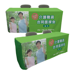 高品質なテーブルカバーでブース全体の雰囲気を格上げしませんか?シンプルなデザインから写真入りのにぎやかなデザインまで、あらゆるニーズに対応。さまざまなサイズの机に対応し、設置も簡単。お客様の目を引くブース作りをお手伝いします!