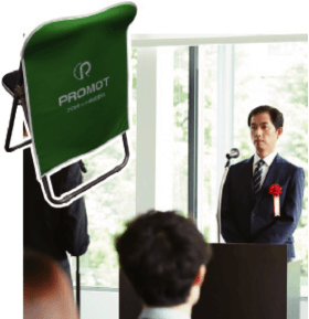 「細部までこだわる展示会演出!」椅子カバーで統一感のあるブースを演出。椅子の背面全体でしっかりアピールしましょう!脱着は非常に簡単なので準備の手間も軽減。椅子を並べるだけでブース全体のブランドイメージを盛り立てます!